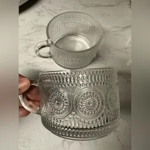 Stackable Set of clear textured mugs. Elegant design with intricate patterns.