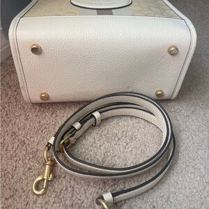 Stylish Coach tote with a tan and cream pattern. Features signature logo and gold accents. Perfect for everyday use.