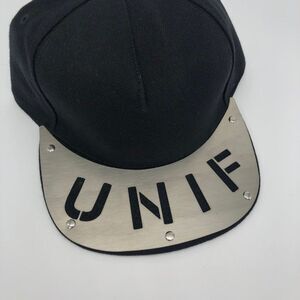 New without Tags UNIF black baseball cap hat with flat bill and silver metal UNIF on the front. One Size.