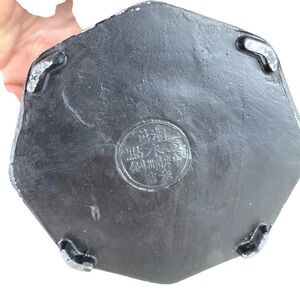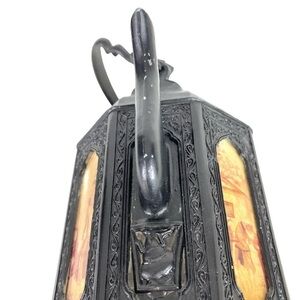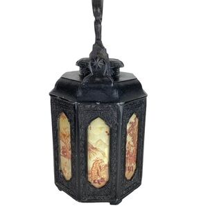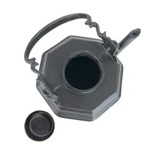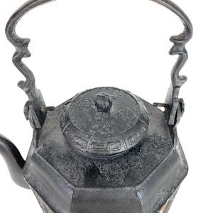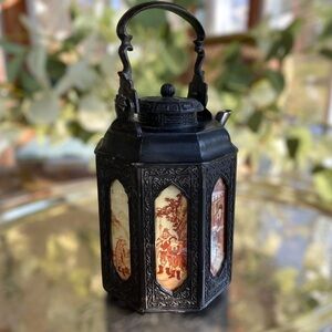 This is for a vintage Chinese Shantou pewter metal teapot / kettle with lid. This is octagon shape with 7 reverse glass painted panel inserts with scenic pictures. There are a few paint nicks, please look at pictures. The teapot measures 6” X 4 1/2” X 6 1/2” tall with the handle down. The handle would add 3” to the height.