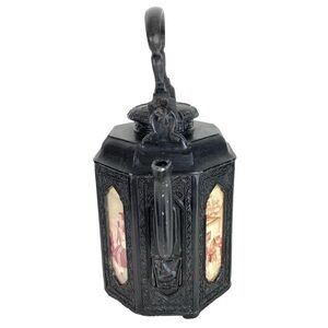 Vintage Chinese Shantou Teapot Pewter Metal Reverse Glass Painted Panels Black