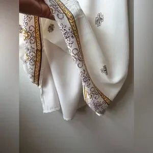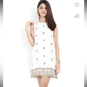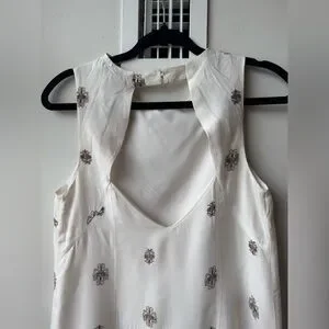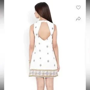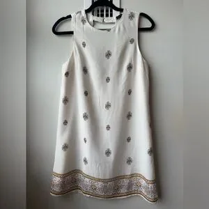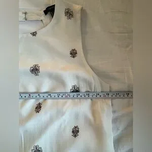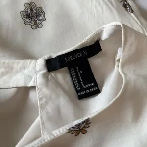 This chic sundress from Forever 21 features a sleeveless design with a crew neck, perfect for a wedding guest or cocktail occasion. The dress showcases a white base with a subtle cream pattern, adding a touch of elegance to its A-line silhouette. See photos for measurements. Coming from a pet free and smoke free home.