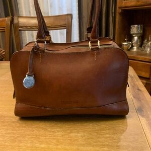 Crafted from high-quality brown leather, this Dooney & Bourke satchel features a structured design that exudes sophistication. Its polished finish and classic shape make it a versatile accessory for any occasion. The bag does show signs of wear because it’s used