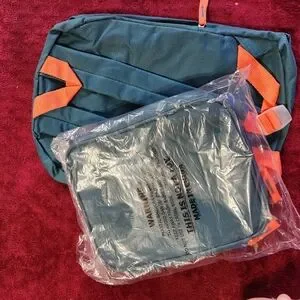 perfect bag and lunch set for first time school goers Dynamic backpack with dinosaur design. Features blue, green, and orange hues. Ideal for school or travel.