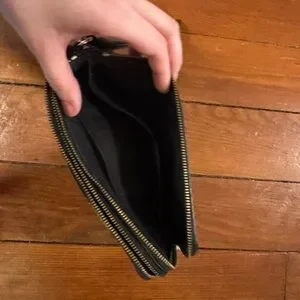 Sleek and stylish black leather wristlet. Perfect for carrying essentials with ease and elegance.