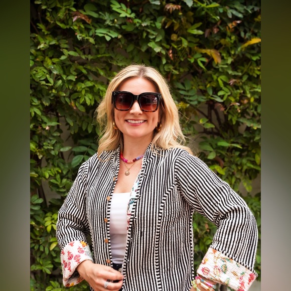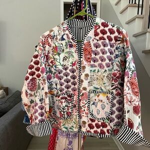 Block print, each jacket is unique in the way the fabrics are sewn together, two pockets in the front and button closure