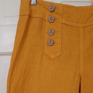 Discover the effortless elegance of the Elevenses Yellow-gold wide leg pants. Crafted from a lightweight fabric, this piece offers a relaxed fit with a high-waisted design, perfect for warm weather. Flat front accented with doulbe columns of big brown buttons that open on one column for closure. Its vibrant yellow hue adds a touch of sunshine to any wardrobe.