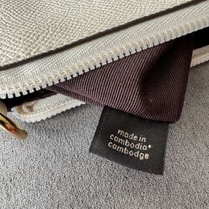 This Coach bag in a pristine creamy white color embodies a minimalist and classic design. Crafted with attention to detail, it features a sleek rectangular shape and a secure zipper closure. Ideal for organizing essentials, this bag is a stylish and functional accessory for any occasion.