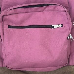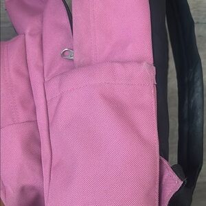 Vibrant pink JanSport backpack with a brown base. Ideal for school or travel.