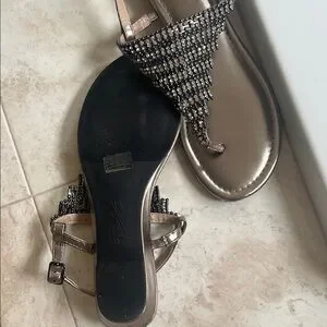 Thalia Sodi Black and Silver Sandals with T-Strap Design
