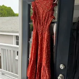 Outerknown Red Smocked Maxi Dress V-Neck Flutter Sleeve