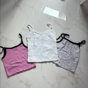 This set includes three stylish tank tops. One is pink with black straps, another is white with a butterfly design, and the third is patterned with black straps. Perfect for casual wear! Never worn! #tween #teen
