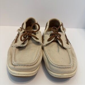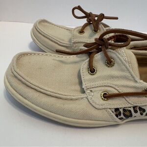 Stylish Sperry boat shoes. Tan canvas with leopard print detail. Perfect for casual wear.
