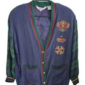 Step into true grandma-core charm with this unique vintage cardigan! Navy fabric, plaid sleeves, and detailed embroidered crest patches, this piece blends preppy, cozy, and retro all in one. Gold-tone buttons and striped trim give it that classic heritage look.