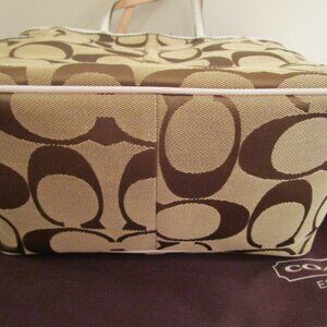 From the 2006 Season is this brand-new, never-used Coach Graphic/White Trim Fabric tote with a dog-leash type closure. This bag is strong enough for a few books and a small computer. It still has the original packing material. It comes with a dust bag but there are no protective feet. This does not have any kind of a shoulder strap. Inside is a vachetta-type leather trim. There is a big zip pocket and slip pockets as well. Always stored in a smoke-free, pet-free area. No odors. Notice the sides have small, turnlock closure pockets. This is another great everyday Coach bag. It measures 12 inches high by 10 inches wide with a 5 inch base width. The handles have a 7 inch drop.
