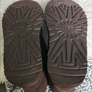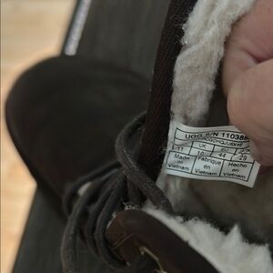 Stylish UGG boots in dark brown. Features cozy cream lining. Ideal for comfort and warmth. I bought these for my husband and only wore once-our loss is your gain