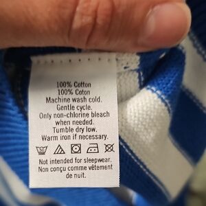 Charming blue sweater with bold yellow and white stripes. Ideal for casual outings.