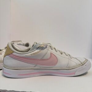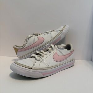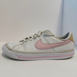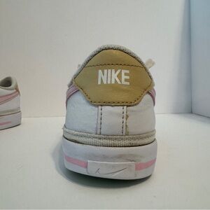 Cute and colorful Nike sneakers in youth size 6Y (fits women’s 7.5–8). Features a white leather upper with a pastel pink swoosh, mustard yellow heel detail, and green rubber soles. Unique colorblock design with a sporty silhouette — perfect for everyday wear or standout street style.