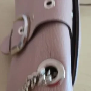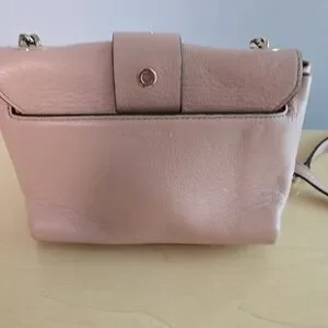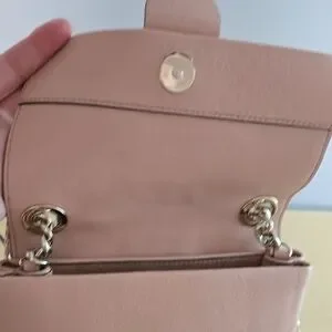 EUC Henri Bendel mini Riverside bag. This elegant pink bag features a stylish chain strap and a chic buckle design. Perfect for adding a touch of sophistication to any outfit. strap is gold tone with leather where its belted now is 44 inches long. has 1 more inch to make longer. needs a little love, but very pretty