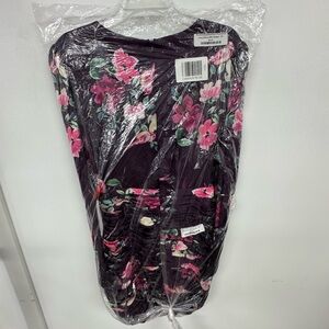 Step into elegance with this Mac Duggal dress, perfect for a wedding guest or cocktail event. The sheath silhouette is complemented by long bishop sleeves and a classic crew neck, all in a stunning floral design with a purple and pink color palette. This dress promises to make a statement with its sophisticated design and vibrant hues.