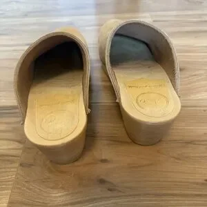 Our bestselling clog style on our mid heel base. Smooth, pale beige nubuck upper. Stitched collar, rounded toe, and open back. Lacquered, lightweight wooden base. Unlined.