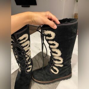 Embrace the cold with UGG's Black Lace-Up Winter Boots, designed to keep you warm and stylish. These boots feature a striking lace-up design that extends up the calf, ensuring a snug fit and a touch of elegance. Perfect for winter and rainy days, they offer both comfort and durability.