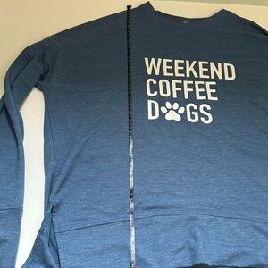 Cozy up in this stylish blue sweater featuring a fun 'Weekend Coffee Dogs' print. Perfect for casual outings and relaxed weekends. Oversized and excellent condition. Preowned rarely worn no stains or tears.