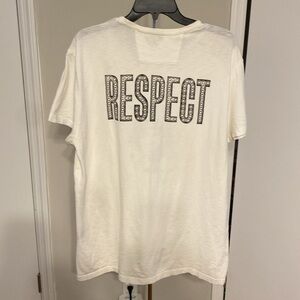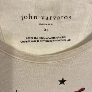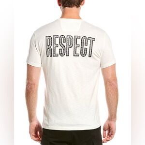 NWT! Slight spot above label above Varvatos, doesn’t show on other side. Should come out in wash. Otherwise perfect! From Aretha’s estate, Mens Respect tee by John Varvatos, size XL. Pit to pit 22” length 30”. So sharp for women or men!