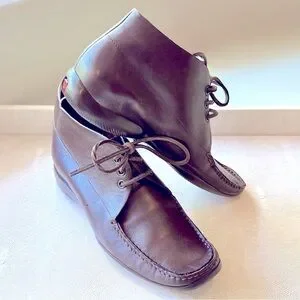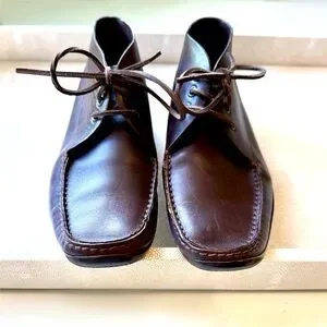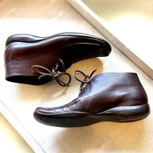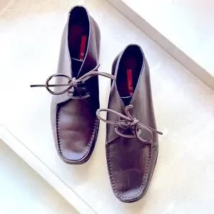 Chic meets comfort in these rare vintage Prada ankle boots for women. Crafted in rich espresso brown leather, they feature a clean square moc toe, tonal laces, and dark rubber soles accented by the signature red Prada stripe logo. Effortlessly cool and versatile—these are the perfect blend of minimalism and luxury.