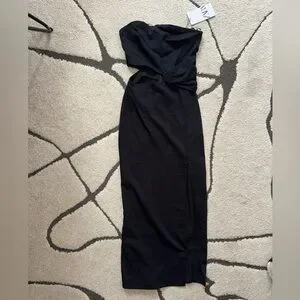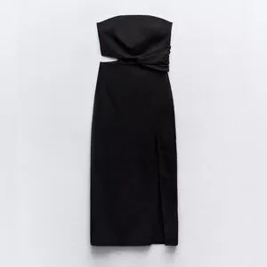 Stylish strapless dress with a sleek silhouette. Features a unique side cut out detail. Perfect for vacation, wedding guest, summer or evening wear.
