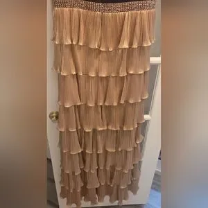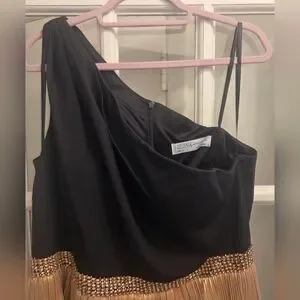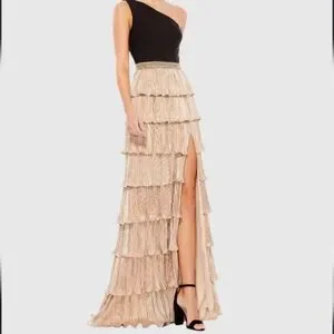 This elegant Mac Duggal dress showcases a striking one-shoulder design, adorned with tiered layers of ruffles that flow beautifully to the floor. The gold and black hues create a sophisticated contrast, while the high slit adds a touch of allure, making it perfect for a cocktail night out, wedding guest, bridesmaids, PROM, homecoming, mother of the bride or groom, Quinceanera and any formal event. NWT!! NEVER WORN!! Accepting "reasonable" offers!!
