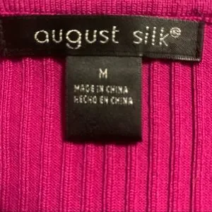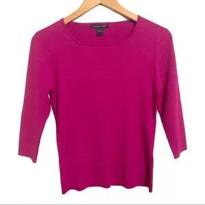 Vibrant pink sweater. Crew neck design. Ribbed texture. Three-quarter sleeves.