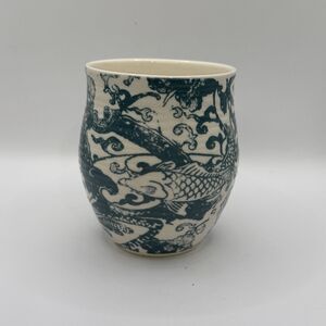 This Anthropologie Homegrown Monogram "B" Floral Fish Coffee Mug Cup is a stylish and versatile addition to any kitchen or dorm room. The mug features a painted fish design on a round, teal ceramic base, with a capacity of 14 oz. It is suitable for both hot and cold beverages, and is microwave and dishwasher safe for easy use and cleaning. This contemporary coffee mug is perfect for any occasion, whether for casual use or as a collectible item for fishing enthusiasts.