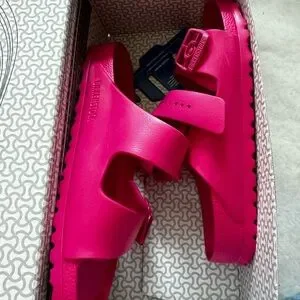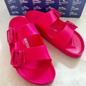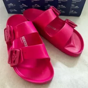 Bold fuchsia Birkenstock slides with dual adjustable straps. Ideal for everyday comfort.