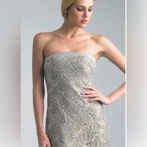 This exquisite Black Label dress showcases a strapless neckline and a form-fitting sheath silhouette, ideal for a night out. The elegant tan and pink hues create a sophisticated look, while the sleeveless design adds a modern touch. Perfect for making a statement at any cocktail event.