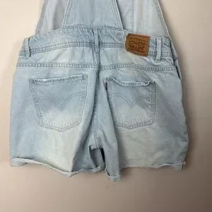 These Levi's overalls showcase a blue denim design accented by striking rainbow multicolored straps. The adjustable shoulder straps add a playful touch, making them perfect for casual outings. Enjoy a relaxed fit with a classic bib-front style.