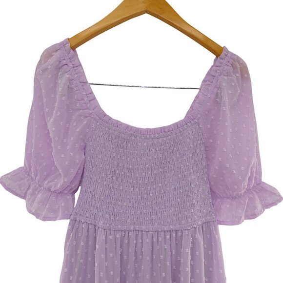 New with tags MEROKEETY lilac midi dress in a dreamy Swiss dot texture. Features smocked bodice, square neckline, sheer puff sleeves with ruffle cuffs, and a tiered skirt with a self-tie bow at the back. 100% polyester, unlined sleeves, flowy and romantic silhouette — perfect for bridal showers, garden parties, or a cottagecore aesthetic look.