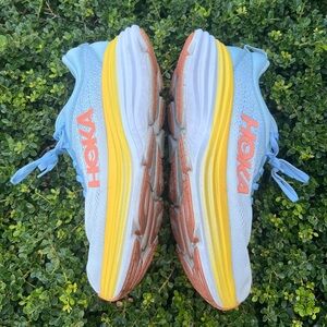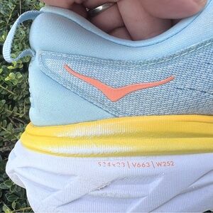 The Hoka One One Bondi 8 running shoes in blue, yellow, white color way (Harbor Mist Lunar Rock) are designed for women in size 11. These are designed with comfortable and breathable fit. Featuring a low top sneaker style with lace-up closure, these athletic shoes are perfect for casual wear and running activities. The outsole is made of rubber for optimal traction, while the upper material is synthetic for durability. With a ombré pattern and logo accents, these sneakers combine style and performance, making them ideal for all seasons. Made in Vietnam, these shoes showcase the Hoka brand and a sports-themed design. MSRP 165.00