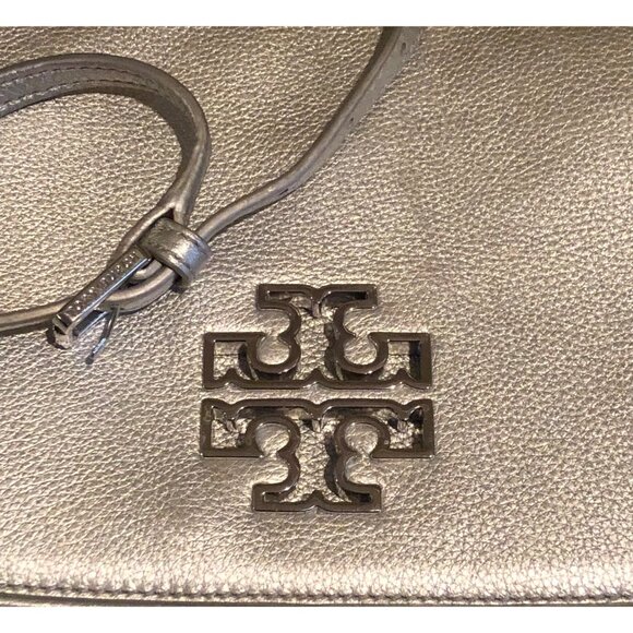 TORY BURCH Britten Crossbody Leather Metallic Silver Handbag Purse