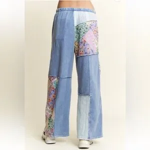 New. Mineral washed floral wave knit jacquard boho wide leg pants with lace insets.