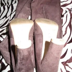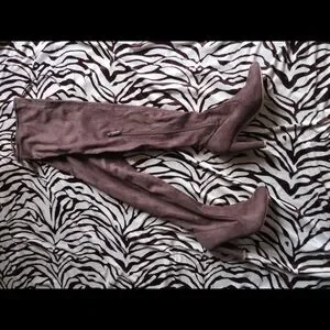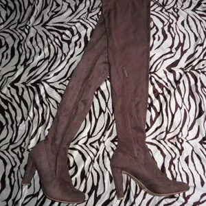 Thigh high khaki boots in suede. Super cute for the fall and winter seasons. Zippers on the size of each boot along with string adjustments. Don’t fit my tiny foot unfortunately but they’re practically new considering they’ve been WORN ONCE! Looking to clean out my closet so MAKE AN OFFER!