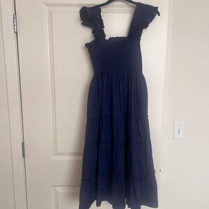 The Ellie is an A-line Nap Dress with elasticated smocking, ruffled shoulders, tiered midi skirt, and pockets. Size S in Navy cotton. The tag is semi-detached but otherwise in really great condition!