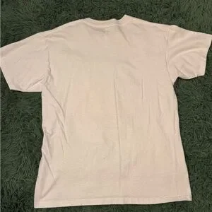 White short sleeve tee. Features a colorful cartoon graphic. Comfortable and casual style.