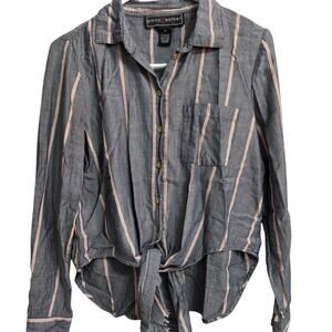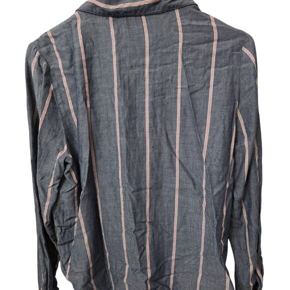 Poly & Esther Woman's Grey with Red and White Stripes Button Down Shirt with Tie Front size M. Made out of 57% cotton and 43% rayon.