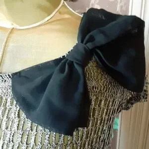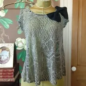 BELLA D Open Knit Pullover Top Open Back Size Medium with Black Bow on the Shoulder.