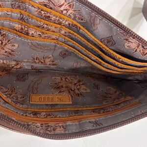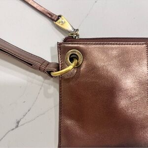 HOBO leather wristlet. I believe the color is as pictured in the first photo. It has more copper metallic tones than bronze; it’s a beautiful leather.