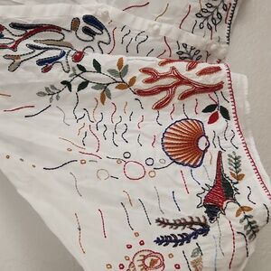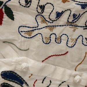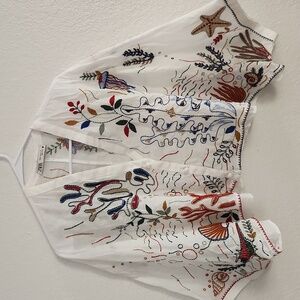 This Zara blouse features a relaxed, oversized fit with cuffed sleeves, offering a chic and comfortable style. The white fabric is adorned with an elegant botanical print in earthy tones, adding a touch of sophistication to the boxy silhouette. Perfect for casual outings or a stylish day at the office.
