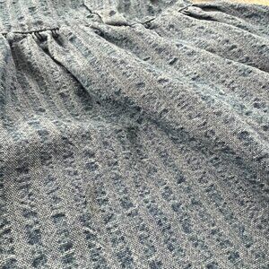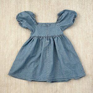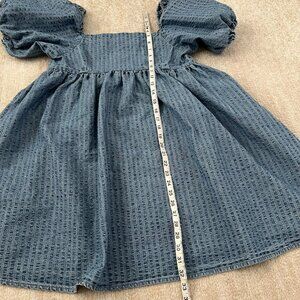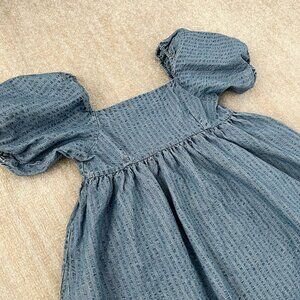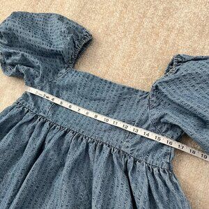 A blue square neck puff sleeve summer mini dress with pockets. Fabric is heavier than chambray but lighter weight than denim. Fabric does not have stretch. Not lined.