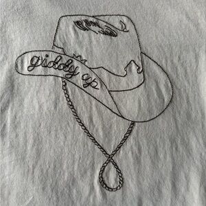 Aritzia Sunday Best Giddy Up cowgirl t-shirt in a beige tone and dark brown embroidery.
