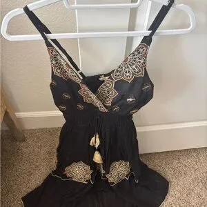 Stylish black boho dress with intricate embroidery. Features a flattering fit and tassel details.